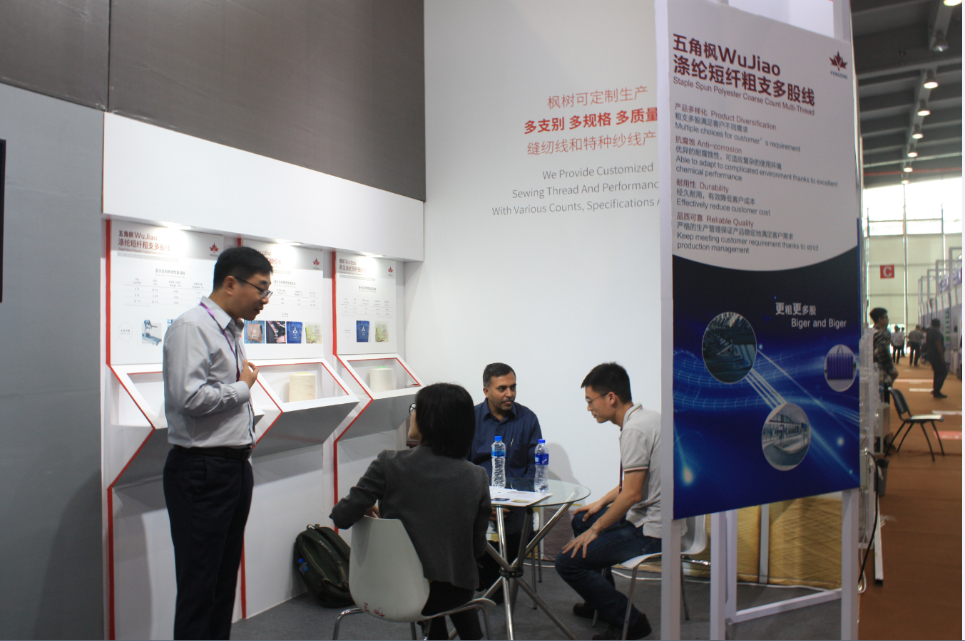枫树线业注重研发,不断寻找满足各行各业客户需求的解决方案,今年初次亮相的涤纶短纤粗支多股线具有抗腐蚀、经久耐用等特点,可以应用在传送带、工业包装袋等多种场景。另一新产品再生涤纶短纤缝纫线更是枫树线业顺应可持续发展理念而研发的绿色环保产品,再生涤纶短纤缝纫线采用GRS(全球回收标准)认证聚酯纤维,产品工艺卓越、品质可靠,每一批产品原材料均可追溯。而作为可以用在高速缝纫机上的棉包涤包芯缝纫线,其优良的吸湿性和耐高温熨烫等性能也深受客商喜爱。这三款新产品一经亮相就受到特别关注,吸引了众多国内外采购商观展咨询,让新产品的推广有了一个良好的开端。