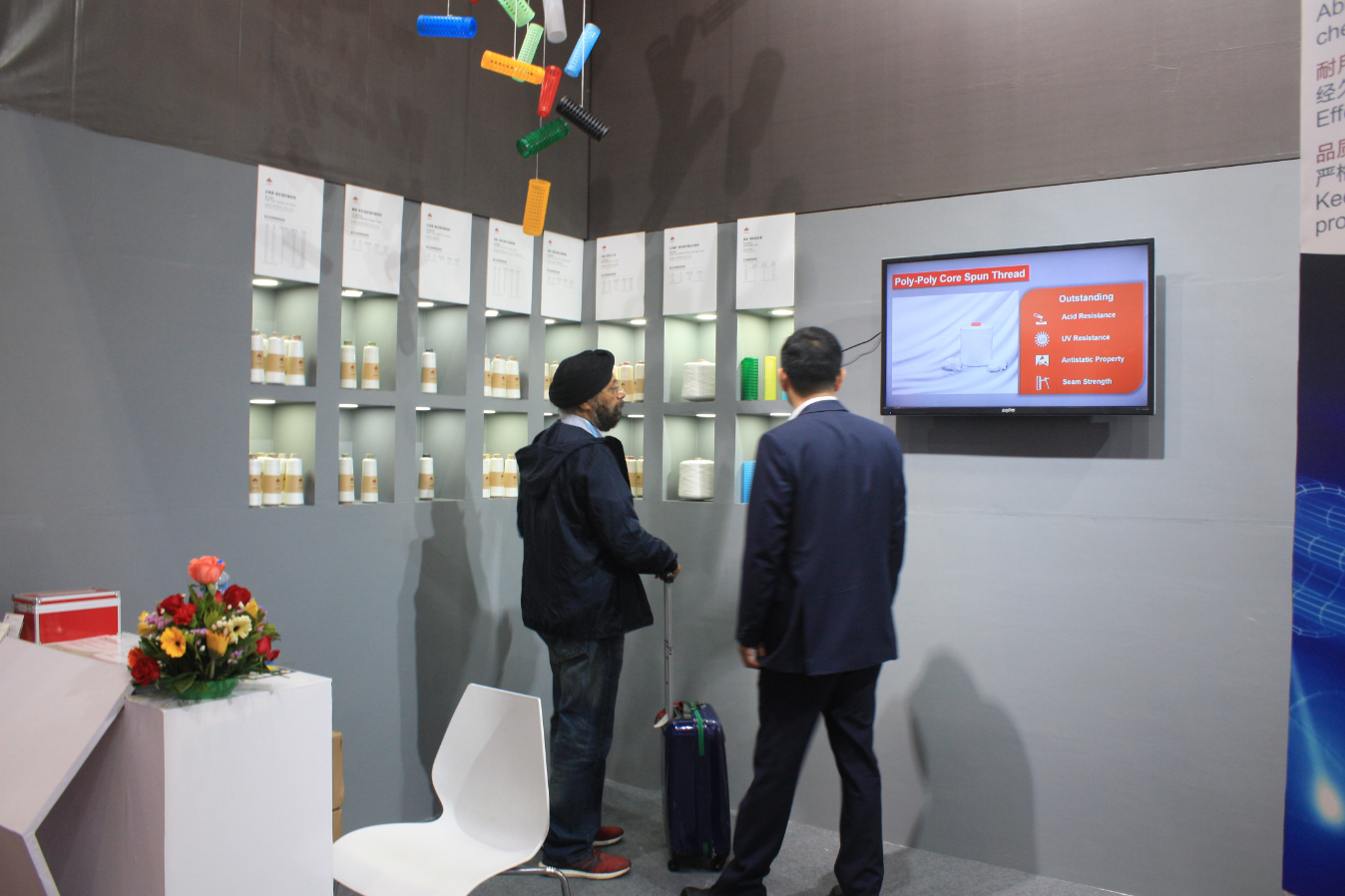本届广交会,枫树线业除了展出涤纶短纤缝纫线、涤包涤包芯缝纫线、芳纶1313等明星产品,还展出了涤纶短纤粗支多股线、再生涤纶短纤缝纫线、棉包涤包芯缝纫线等新推产品,给客户提供了更多选择。展位上,来自全球各地的客商络绎不绝,他们对枫树线业的新老产品表现出极大兴趣。